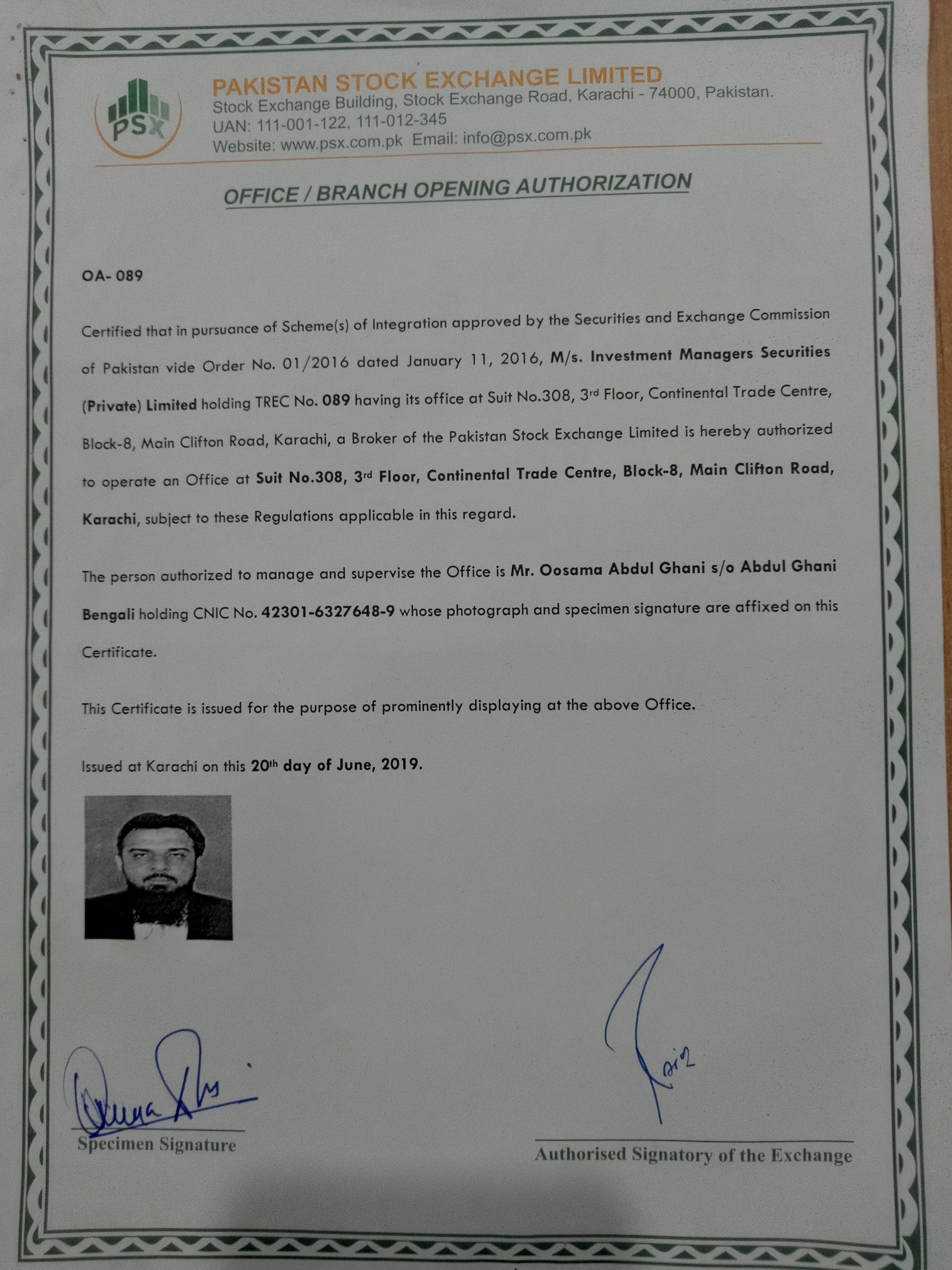 Our Head Office Authorized Agent is Mr. Oosama Ghani. To see certificate click here.